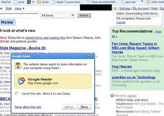 ![]() Welp, there we go. The first obvious, Chrome specific integration, which allows me to run Google Reader offline. Neat. I wonder now if Chrome isn't the source of the rumor that Apple was going to release Safari in some fashion to allow websites, like Google Reader, to be saved as their own WebKit apps. posted by ruffin at 9/02/2008 09:59:00 PM |