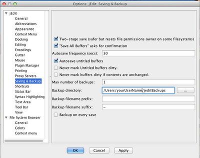 You don't want myFile.cs~ littering up your file system. There are some really heavy-handed fixes out there (like deleting all the files ending in tilde every so often), but that's a far cry from a best practice. In vim, I just set up a backup directory for those files so that they're all in one place, not over the file system. I think that causes some trouble when I edit files of the same name, but I haven't really checked. Still, a much more elegant solution than combing the whole system to blast every backup. But how to do this in JEdit? Here we go... Saving Files: The behavior of the backup feature is specified in the Autosave and Backup pane of the Utilities>Global Options dialog box; see the section called “The Saving and Backup Pane”.` So on a Mac, that's a Cmd-, for Preferences, then the below... ![]() Step 3.) Profit. Labels: jedit, problem solved posted by ruffin at 3/07/2012 09:56:00 AM |