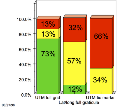 There are a number of sites that describe the way these coordinate systems work in theory, but this single Powerpoint presentation combines the theory with the practical side better than any other single resource I've found on the topic: Navigating the Disaster There's a sustained conversation about using grid systems vs. decimal degrees (lat,lon points) for dealing with on-the-ground emergencies (grids apparently seriously reduced human error when finding points), and a thorough test case for grids during the Katrina disaster response. The worst part of the test? That the 9th Ward in New Orleans was, of course, cut in two by two UTM zones. Here are pictures from the ppt: ![]() UTM is apparently lots of little mini-projections so that we have equal area (?) blocks to slap onto a map that seem to keep their distance at scale. This causes some real issues where zones overlap, however, which receive more illustrative attention within the Powerpoint linked to, above. Here, apparently the pictured overlap was too much for the FEMA GIS Coordinator to handle, and they went from the Military Grid Reference System (MGRS) to decimal degrees instead. What should have been done with the overlap is below. Note the dark line cutting through what's ultimately hexagonal transitional tiles. In FEMA's defense, you admittedly might still have to occasionally figure out where 15 is in 16 and vice versa if someone's GPS reported they were still in one zone after stepping past that bold line. That's a task that, unfortunately, would take especially competent responders (FEMA office and everyone in the field). ![]() So New Orleans' 9th Ward was literally a worst-case scenario for the MGRS. Why, then, was using lat,lon potentially a very bad idea? The presentation here argues that the potential benefits for grid use (at least where there isn't overlap, or where overlap can be dealt with properly) appear immense. I'm going to include two more pictures, one showing grids vs. lat,lon "blunders" (red is over 150 meters, green under 15) and another picturing the difference. ![]() ![]() Those last two are taken from a publication from the Powerpoint's author: Terry, 1994, Photogrammetric Engineering & Remote Sensing, Vol 63, No. 4, Apr 1997, p.381 - 383. Now, again, the Powerpoint author doesn't relate those findings to using the grids in multizone areas like the 9th Ward of New Orleans. I imagine those numbers would change quite a bit. At least lat, lon is unambiguous -- there's no mental calculation when traversing arbitrarily placed bold lines (arbitrary in that the MGRS could have started a mile father east and spared at least New Orleans the trouble). (Aside: If Sweden can have its own UTM zone exception, it might be worth putting one in for New Orleans as well. But even so, it's hard to think that a little preventative education wouldn't've allowed grids to work well -- likely significantly better than lat,lon -- even in this worst case.) What's the connection to programming? I inherited code with a horrible, inaccurate, buggy UTM to MGRS translator, and I'm trying to make sure I'm educated enough to test the at least excellent looking new library our team's found to make sure it's a solid improvement. That link also has excellent descriptions of what's going on with MGRS and a walkthrough of his code. Labels: gis, javascript posted by ruffin at 9/18/2012 09:56:00 AM |
