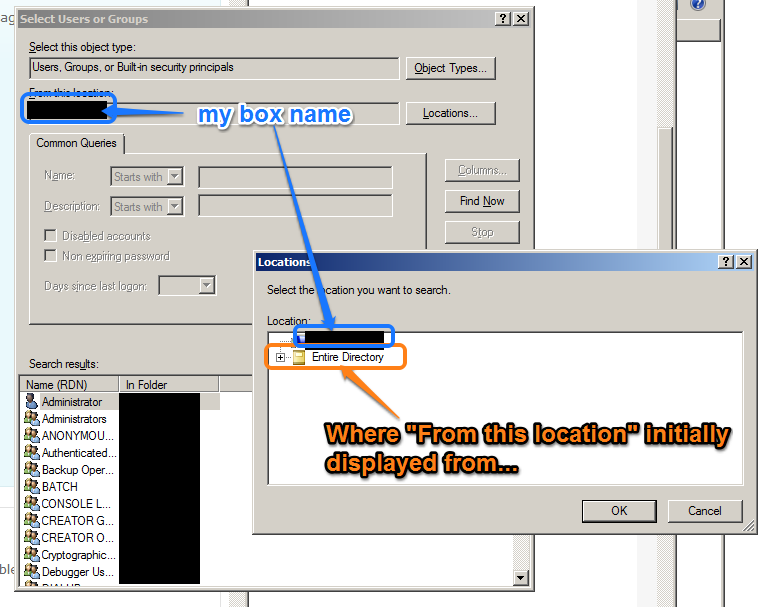This started well (though I'd flubbed my way through most of that already right-clicking around), but I couldn't get the "Add >>> Select Users, Computers, Service Accounts, or Groups" to give up the IIS_USRS user.