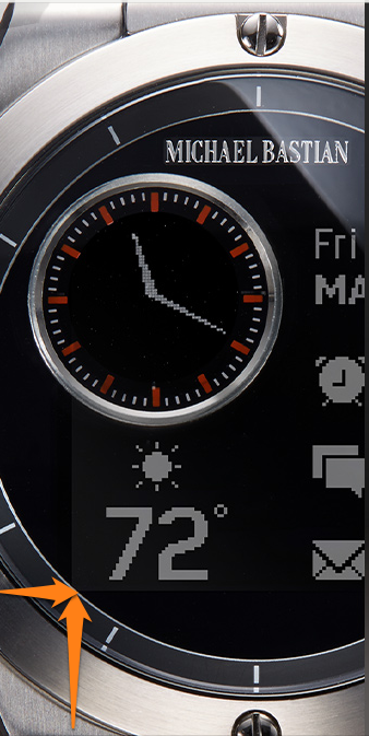 So the "watch widget" ring and the tick marks are permanent, but the hands come from the admittedly not retina-quality screen. Also note the orange arrows I added, pointing at the edges of the square watch screen. That's a little cheap looking, though not quite as silly as black bottom bar on the Moto 360, but in a similar, "We botched the implementation," vein.