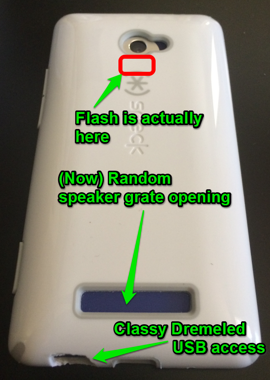 EDIT: I missed a big difference that I'll hopefully update in a bit -- The microphone has moved as well! So you have to drill a hole for the mic in the bottom of the case or folks will think you're talking from behind a wall. Oops. The HTC 8XT is essentially an HTC 8X (AT&T, Verizon, T-Mobile) changed just enough to work on Sprint's network (and, in my case, Ting's). So I figured I'd grab a Speck case for the 8X, apparently the much more popular model, while they were on sale to use on my 8XT. Whoa. Not so fast, my friend. It turns out there are three distinct ways that the 8XT is physically different from the 8X, and two of those are pretty important when trying to use an 8XT with the 8X case.