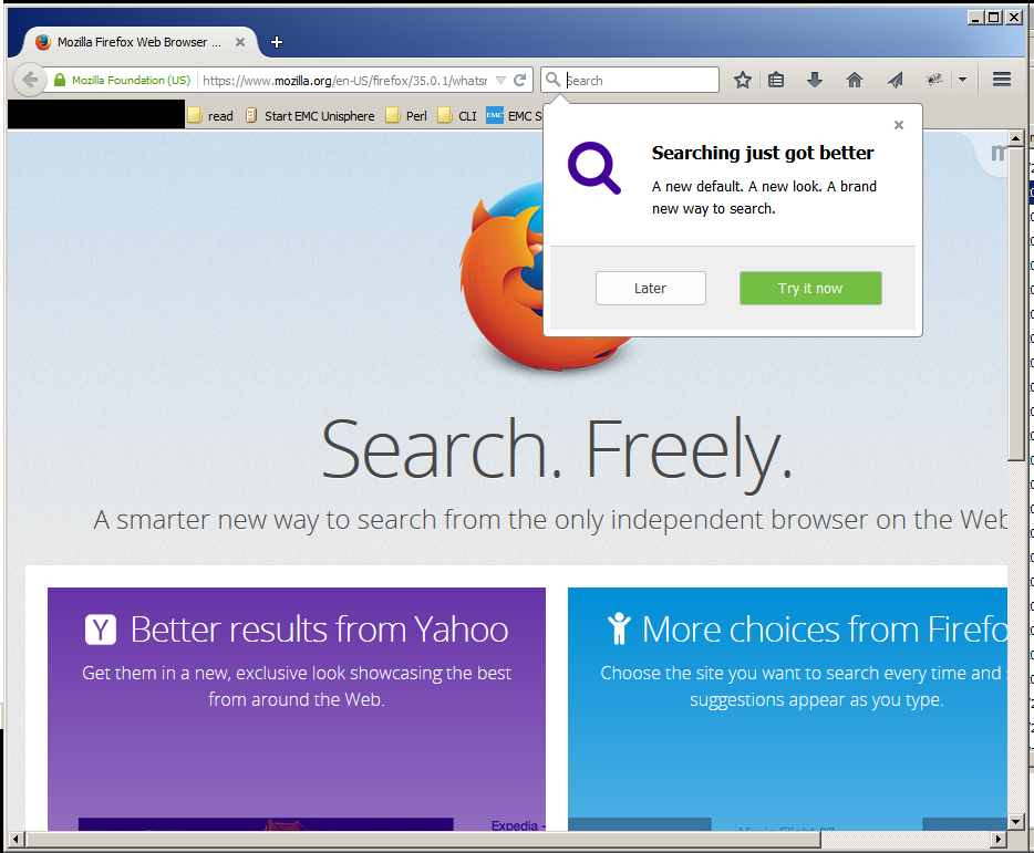 As I've mentioned before, there's no way Yahoo's gains in Firefox search sticks. It took me one search to get disgusted and swap back. I imagine others will have the same reaction with a little less immediacy. No offense, Yahoo, but Google has search down cold, as long as Superfish hasn't infected your box[1]. Better results, huh? By what metric is that measured? I don't even dislike Yahoo. I just don't think it's cool to slam users who are happy with whatever search provider they selected already. I will back down just a touch (as I may have mentioned before) if this only happens if you never swapped search providers. My iMac at home and my work box are pretty new, and I don't recall if my MacBook or Lenovo acted slammed or not (I've flirted with Bing on both a few times over the years). But if Firefox swapped *everyone* to Yahoo, not just those who'd been using Google because it was the default, well, that's unavoidably a slam. Anyhow, now with image. Yay. [1] RLY Lenovo? I'm still getting over that idiotic move. posted by ruffin at 3/02/2015 04:48:00 PM |