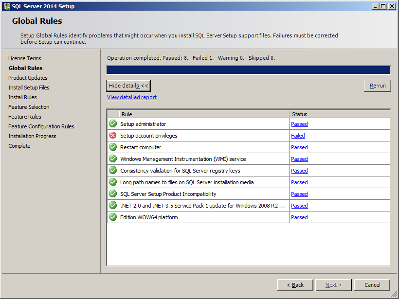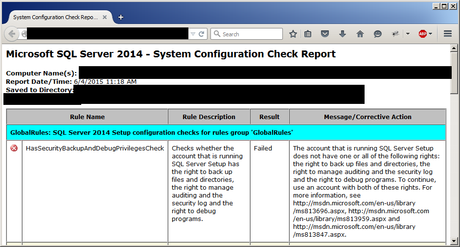 I was trying to install SQL Server Express so I wouldn't have to connect to our dev database, but ran into the dreaded "Setup account privileges" issue (image above, I think). If you're having this problem installing SQL Server Express, I can't guarantee that you're going to get great news here, but this is how you'd fix it if you could... You can open the Local Security Policy interface (or the Group Policy editor) and add the permissions you're missing from there, but the buttons to add to the ones I needed were disabled for me, even though I'm an admin on my box. This is apparently known as the HasSecurityBackupAndDebugPrivilegesCheck rule. The best "how to nuke this issue" I found was from this kb article from MS: