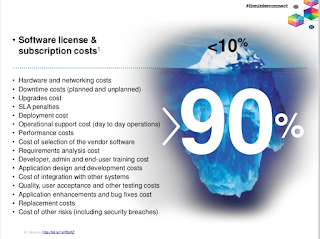 As evidenced by the last post, I've been boning up on my JSP & Java Servlet skillz this week as we prepare to migrate an app I prototyped in Node over to a WebLogic host, its eventual home. I thought it'd be safe to develop against Tomcat, but wasn't absolutely sure, so I started googling around a little. So far, so good. Looks like vanilla Tomcat has, at worst, a subset of the features of every other major servlet container. One of the most promising articles by title, WebSphere vs. JBoss vs. WebLogic vs. Tomcat – presentation from the InterConnect 2015 (it's got everything! All the major servlet containers! It's from this year!) turned out to be a painful foray into marketing-by-blog from IBM, but there was one bonus, the slide (which is now above, but will later be) below: So 90% of TOC for a software system isn't licensing. That's probably true to no-worse-than-trueish. An interesting exercise, however, would be to put numbers -- okay, okay, first you have to recategorize ("Developer, admin and end-user training cost" falls in the same category? RLY? etc) -- beside each of the other categories. Though it's worth saying that a 9% savings is significant any way you look at it, especially for garage-companies where developer and admin cost is paid in elbow grease. Labels: development, management posted by ruffin at 7/01/2015 01:57:00 PM |