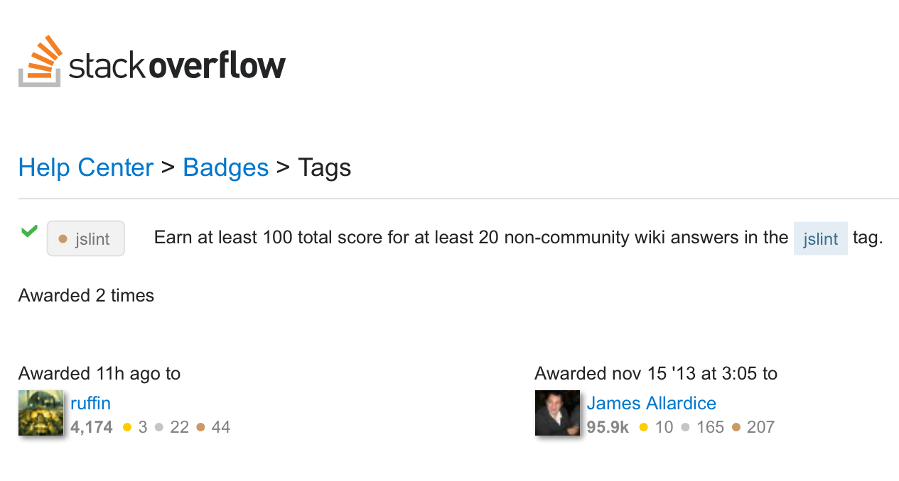 Overly long story a little shorter, here we are. I'm the second person in StackOverflow history!!!1!1!!2 to bag the JSLint badge. And boy, I did it the hard way (which is not a complement to me). The first guy to get it, James Allardice (who also has the JSHint badge) currently has 202 points answering 32 questions. I've got 101 for answering 57. I'd like to think James plowed up the ground pretty well with the obvious answers (I've gotten 24 of my points for being the first to document `ignore`, for instance), but still.
