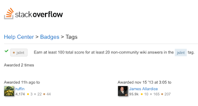 I'll try not to get too verklempt, but I finally hit my informal goal for StackOverflow: I received the [second] JSLint badge [SO's awarded]. It used to be difficult to program without googling answers to what were sometimes painfully easy questions -- it was just more efficient that coding "from scratch". Now, it's even more difficult to code without leaning heavily on StackOverflow. It's also hard to get that much value without giving something back. Admittedly, I'm nowhere near as "giving" as one of my old coworkers, who is creeping up on 80,000 StackOverflow points as I blog. But you can't use it without finding some means of giving back. For me, it was sitting on the JSLint tag. We started using JSLint at a company I worked with a while back, and I think I was one of our better JavaScript guys (ie, Whitaker, above, was pretty busy, so I guess I was second), so I got stuck with implementing JSLint as a company-wide blocking check-in test for TFS. I first got a Visual Studio JSLint extension working and configured like we wanted it, then I copied what it was doing and wrote a TFS rule using Noesis, the same engine that plugin used, to test files folks were checking in, slowly forcing us to JSLint our legacy code (though with exceptions for third-party libraries) as we edited files. Looking back, I should've used Node, which would have been much easier, but Noesis didn't require any serious installation. Anyhow, when you're the contact person for something like this, of course you also end up being the person who actually does much of the linting, as almost every time someone edited a file over a hundred or so lines, I'd get an email about how difficult and unfair the new policy [though I believe JSLinting code is a great idea, it was our dev manager's idea, so the unfair complaints were unf. misdirected!] was. With a few folks, after a few good tries to convince them otherwise, it was ultimately easier to spend the time linting than arguing, though I feel badly I gave occasionally relented and gave fish rather than taught folks how to get 'em themselves. Admittedly, some of those files were a mess, and having everyone in your company editing JavaScript regardless of their expertise in the language is also a bad policy. Some folks (I'm looking at you, most of the iOS team!) probably had no business being in the JavaScript files to begin with. (Note: I never so much as opened an Objective-C file while working at said company. ;^D) Regardless, like Jim Morris pitching, the unofficial work meant I became pretty good at understanding JSLint. More importantly, JSLint was (and is!) a manageable tag on StackOverflow. I'd learned it was easy to get reputation at SO just by sitting on topics and being the first to answer, but that wasn't always the best way to learn, and seemed to be more gamification than "scholarship". It's the difference between sitting on jQuery and wishing you could sit on child jQuery selectors or DOM concatenation. But JSLint had that specificity built-in. It was a small pond, but active enough that you could actually contribute. Overly long story a little shorter, here we are. I'm the second person in StackOverflow history!!!1!1!!2 to bag the JSLint badge. And boy, I did it the hard way (which is not a complement to me). The first guy to get it, James Allardice (who also has the JSHint badge) currently has 202 points answering 32 questions. I've got 101 for answering 57. I'd like to think James plowed up the ground pretty well with the obvious answers (I've gotten 24 of my points for being the first to document `ignore`, for instance), but still. There are at least 20 people with more JSLint points than me, but since only one has 20 or more answers in there, I still get to be second badged JSLinter on SO. (TJ Crowder will be there soon, I think, but other than Quentin at 13, nobody else has 10 answers.) I also like that with the exception of the last two guys on the list, who essentially have the same rep as me, everyone else has 3k or more than me, many with tens of thousands more. It's good company. Looks like my first JSLint answer was on 5 Feb 2013 (with my first question on 1 May 2012), when nobody had earned this tag yet. Just a little over two years since Allardice bagged the tag, and just over 33 months since I started, I get the second. Nobody remembers the second schmoe on the moon, but that doesn't mean it wasn't enjoyable taking the trip. Guess I'll keep watching JSLint, but (and I'd already kinda started relaxing) I'll be a little less likely to want to be FIRST! and more likely to just chime in when I have something good to add. Which is how StackOverflow should work. Labels: coding, goals, JSLint, stackoverflow, style posted by ruffin at 11/20/2015 01:44:00 PM |