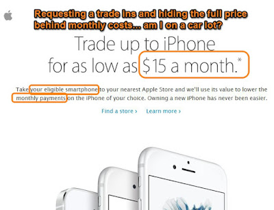 I understand that Apple's just trying to jump in and replace carrier subsidies, but when you email me a deal that sounds like it came from my local car dealership, I begin to worry about your bottom line. What's the problem? As I have in the heavily edited image, above, I don't like it when you, first, encourage me to trade in a used device without it hitting the open market. That almost always means you're not going to give me what it's worth. I think I've mentioned how a friend of mine and I have joked that we could just hang out in GameStop and offer anyone in line trading in hardware 50% more than GameStop is going to give them and still make a profit. Similar too is the used car trade-in, where you almost always are taking a least $1000 less than you'd make selling the car yourself on Craigslist or what-have-you. Second is the move to monthly pricing rather than directly listing a fair price for the item. I know Apple's had a number of financing offers in the past, but it's usually in small blue print under the full price of whatever product you're viewing. I also know that Apple's been able to offload the monthly fee in folks' monthly wireless bill, which is also a little nasty, honestly, because what was really happening is that some percentage of people forgot they were financing their phone with that wireless payment and wouldn't upgrade (or find a cheaper provider) once the phone was paid off. What a scam. Either way, though, we've got Apple reaching directly for more cash on the table with adverts like this one. I was originally planning to hold my Apple stock [that I thought I should've sold around $110. What an idiot I am for not doing it], but I don't know now. Not having subsidies might be a bigger deal for the bottom line than I've heard anyone mention. That is, this ad is dirtier than anything I'd seen from Apple -- "Bring us your trade-ins, and we'll get you financed on the lot!". I guess they're losing their saleshumans that used to do the dirty work, but that doesn't make today's tact any less nasty. posted by ruffin at 2/22/2016 02:01:00 PM |